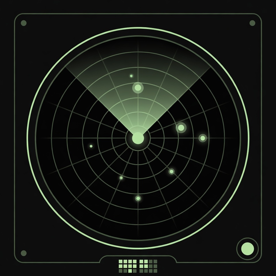 A digital radar screen features a glowing green circular display with a central bright dot and sweeping beams. Multiple green blips are scattered across the grid-patterned background, indicating detected objects. The interface includes a square frame and small status indicators at the bottom.