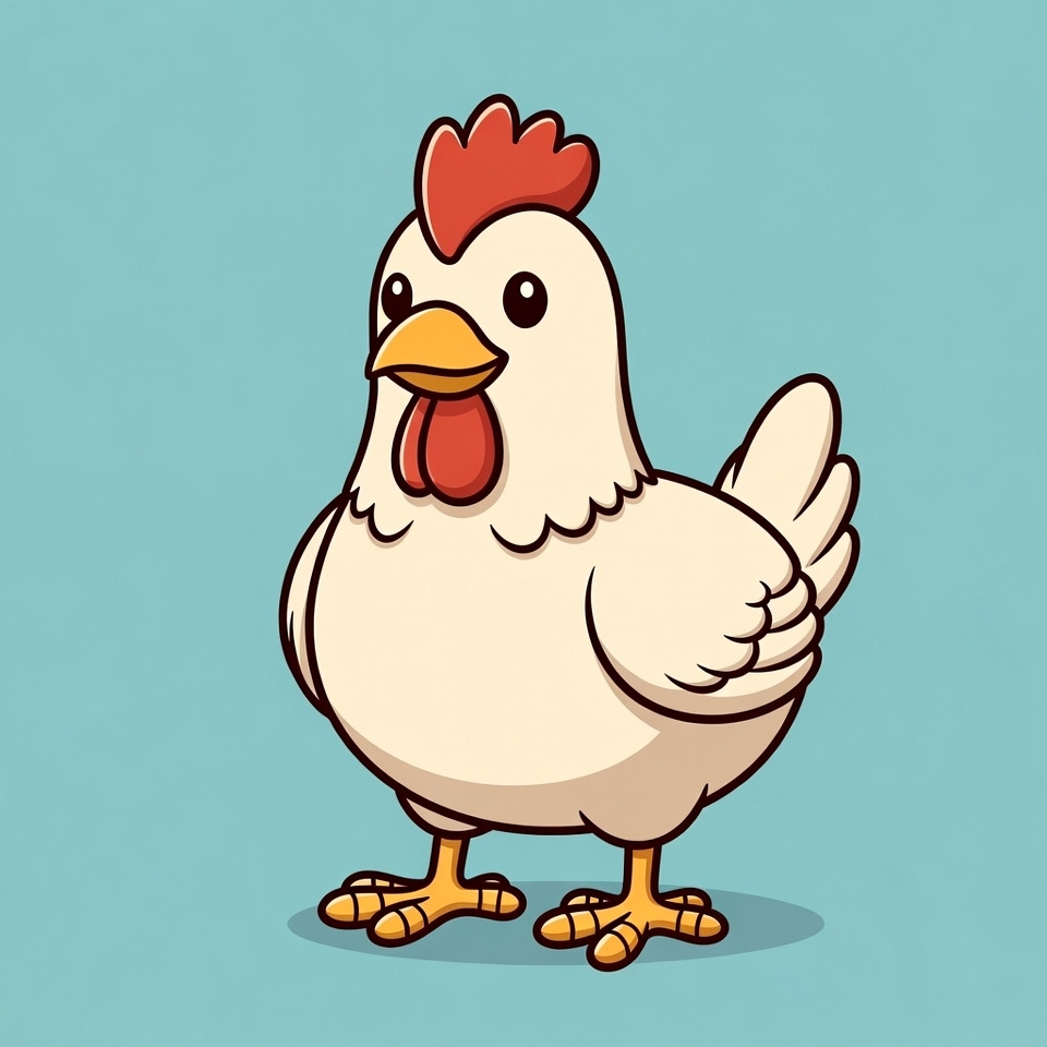 animated, big eyes, bird, blue background, cartoon, chicken, clipart, cute, farm animal, fluffy feathers, illustration, isolated, kawaii, orange legs, red comb, standing rooster, vector art, white rooster, yellow beak, rooster