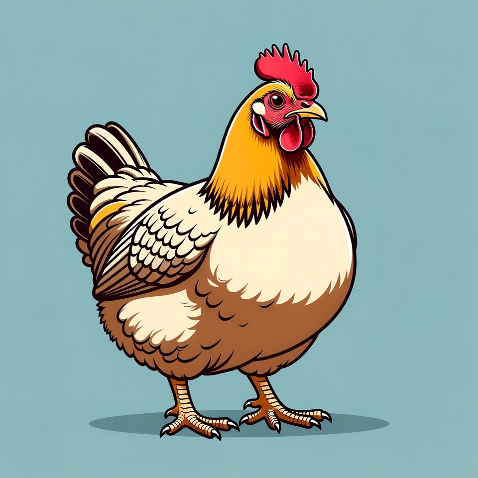A vibrant cartoon illustration of a rooster stands on a light blue background. The rooster features a bright red comb and wattle, yellow neck feathers, white body plumage, and detailed black tail feathers. Its legs are yellow with sharp claws, and it faces forward with a red eye.