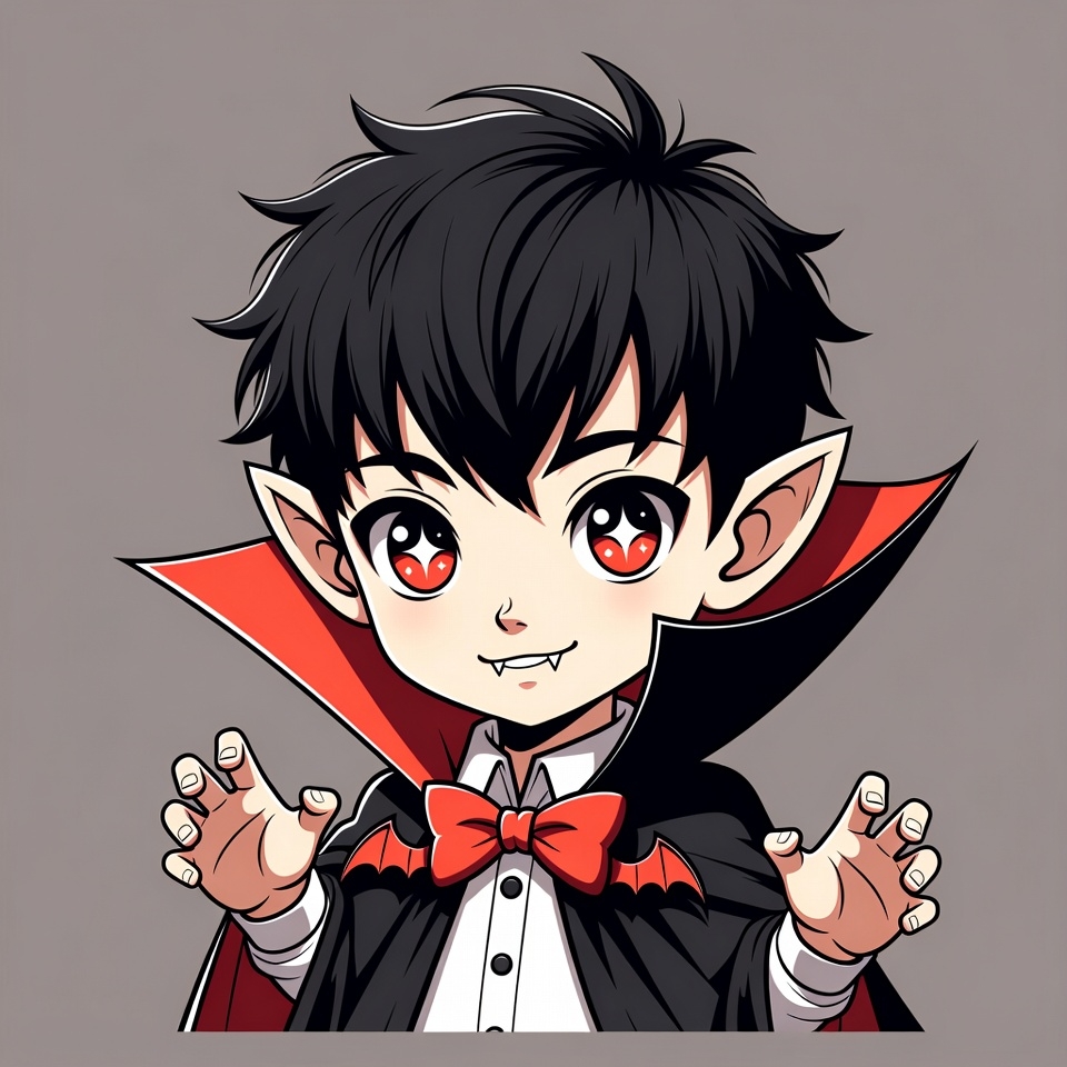 Asian, Halloween, anime style, bat ears, black hair, bow tie, boy, cartoon, chibi, cute, fangs, hands raised, illustration, isolated background, playful, red cape, red eyes, white shirt, vampire boy