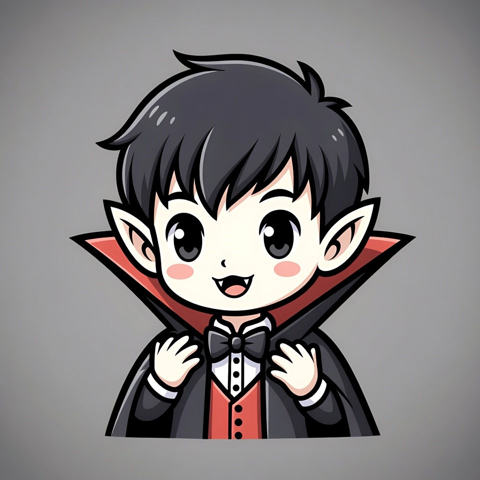 A chibi-style cartoon illustration of a young vampire boy with black hair, pointy ears, and large expressive eyes smiles happily. He wears a red cape with a high collar, white shirt, black bow tie, and black vest. The character stands against a plain gray background.