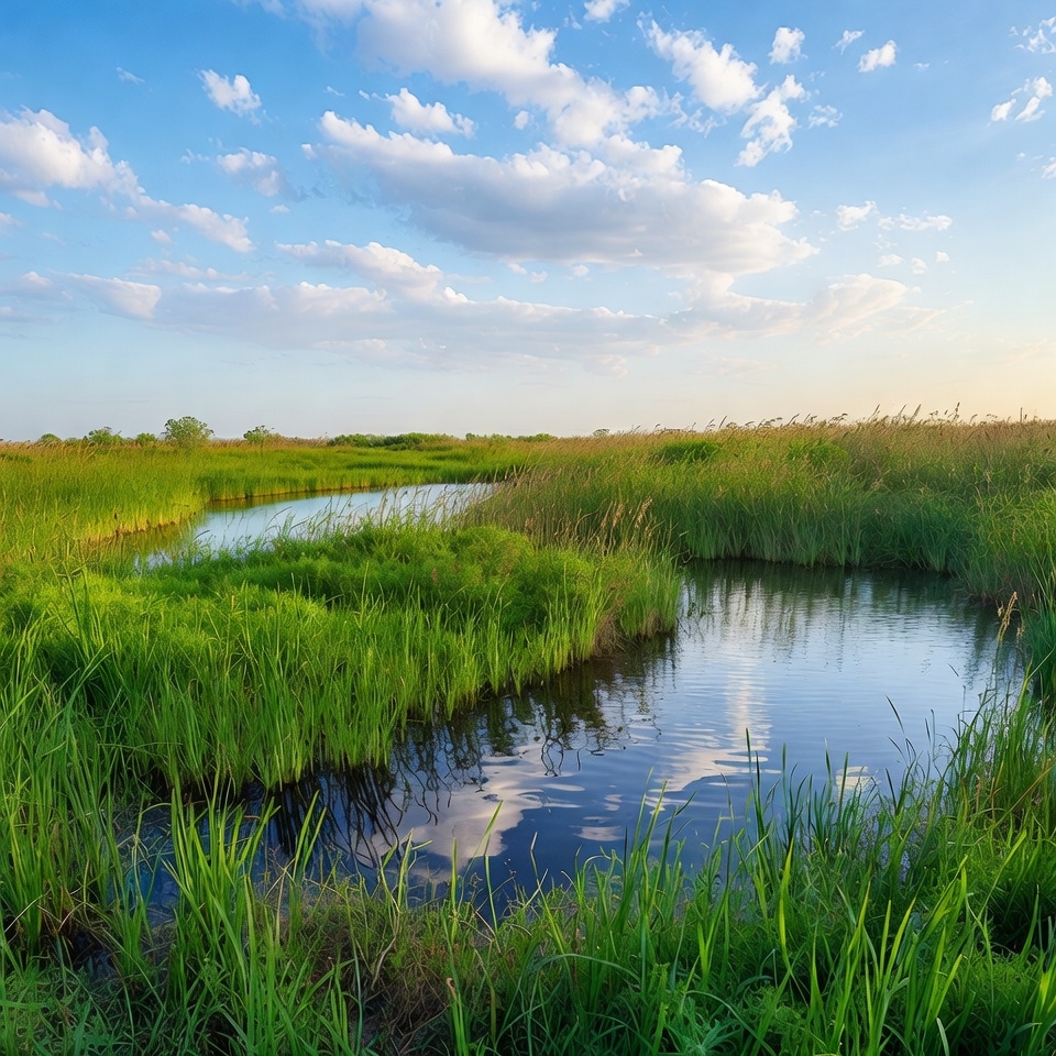 blue sky, calm water, clouds, field, grass, grassy marsh, green grass, horizon, landscape, lush vegetation, marsh, natural, nature, outdoors, peaceful landscape, reeds, reflection, river bend, scenery, sky, stream, sunny day, water, wetland, white clouds, river