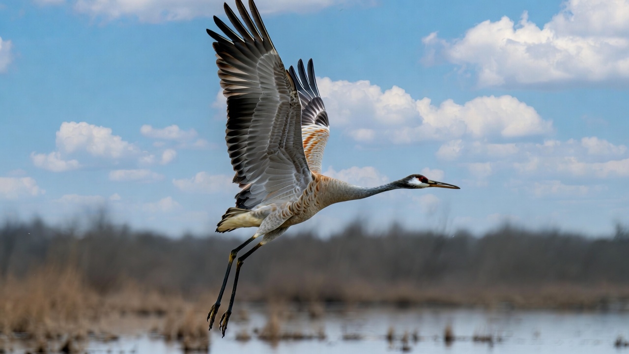 Sandhill Crane Flying over Wetland