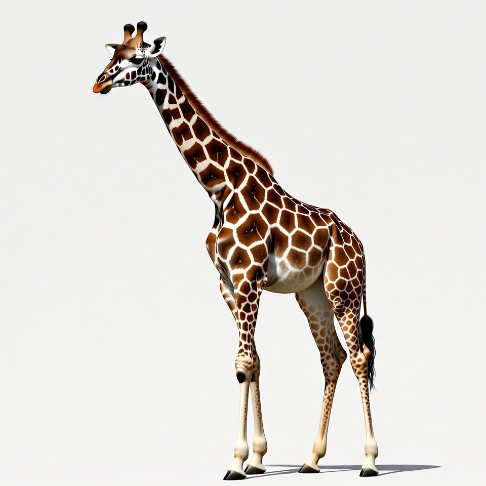 A tall giraffe with distinctive brown and white spots stands gracefully on a plain white background. Its long neck extends upwards with ossicones on its head and a short tail. The image features a subtle shadow beneath its legs.