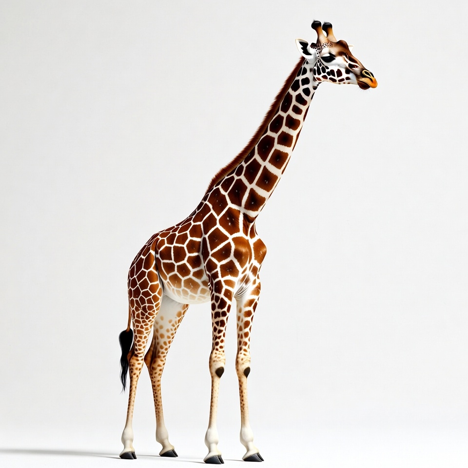 A tall giraffe with distinctive brown and white spots stands gracefully on a plain white background. Its long neck extends upwards, with ossicones on its head and a short tail. The giraffe faces slightly to the side with its mouth closed.