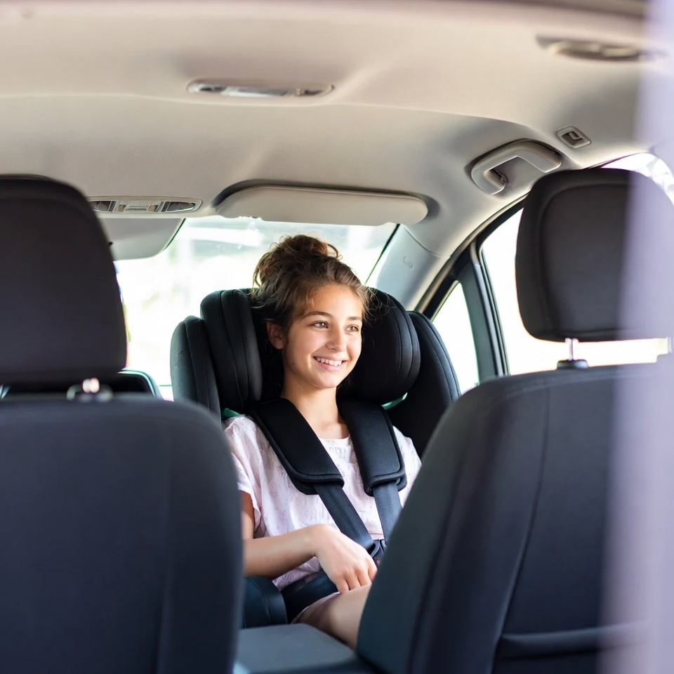 A young girl with brunette hair in a messy bun smiles happily while seated in a black car safety seat inside a vehicle. She wears a light pink short-sleeved top and khaki shorts, secured by black shoulder straps. The car's interior features light beige upholstery and headrests, with windows visible in the background.