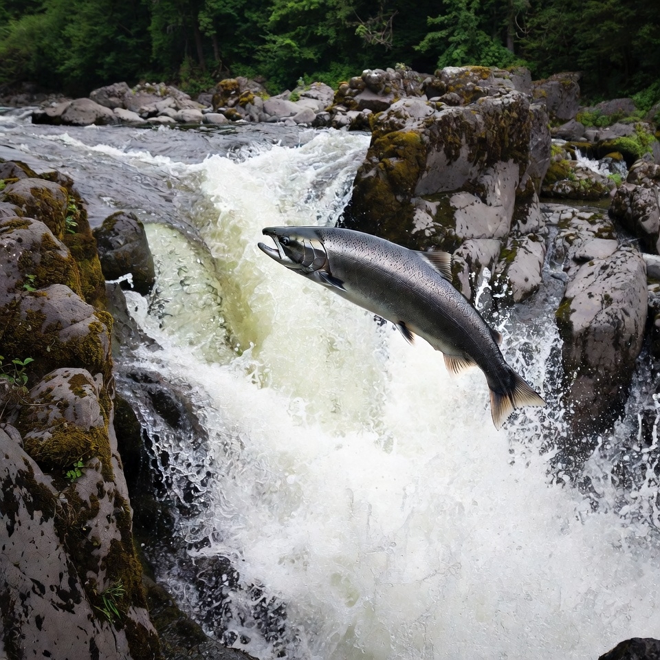 A large silver salmon leaps high over a cascading waterfall in a rocky river surrounded by lush green forest. White water splashes around the fish as it jumps amid moss-covered rocks and boulders. The scene captures the dynamic motion of the salmon mid-air against the natural river rapids.