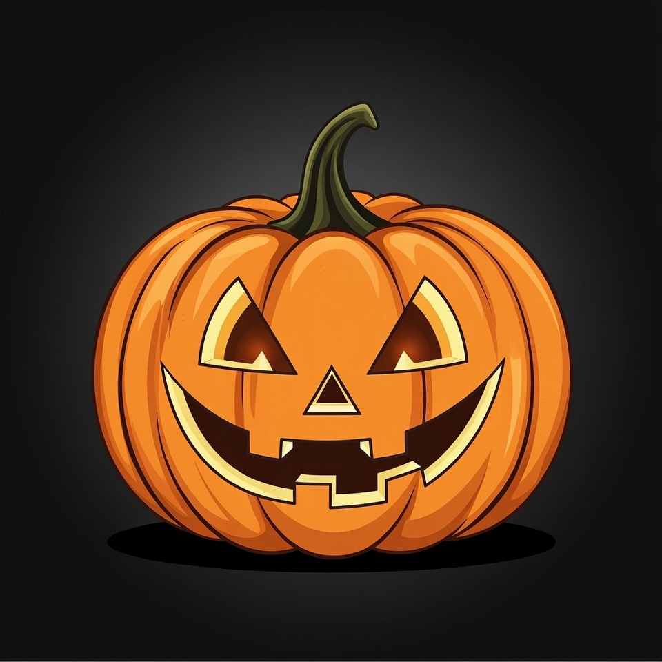 Halloween, autumn, carved pumpkin, clipart, dark background, festive, glowing eyes, green stem, illustration, isolated background, orange pumpkin, pumpkin, smiling face, spooky, vector art, jack-o-lantern