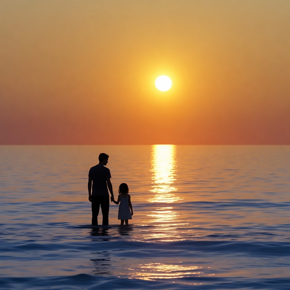 A silhouette of a father and young daughter stands in shallow ocean water at sunset. The bright orange sun is positioned directly behind them, reflecting on the calm sea surface. They hold hands while facing the horizon.