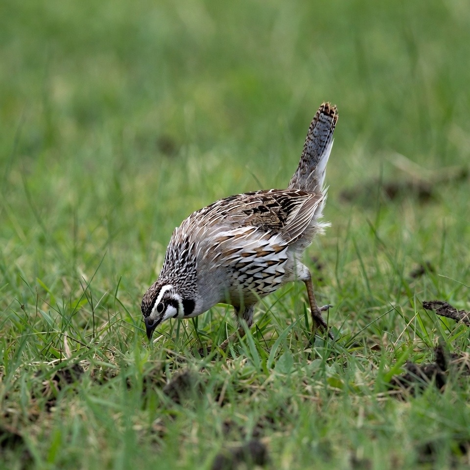 bird, brown bird, field, foraging, grass, green grass, nature, outdoors, pecking, quail bird, small bird, striped feathers, wildlife, quail