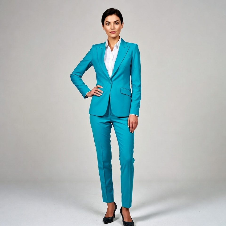 A woman with dark hair stands confidently on a plain gray background wearing a turquoise blazer, matching pants, and white dress shirt. She has one hand on her hip and wears black high heels. Her expression is poised and professional.