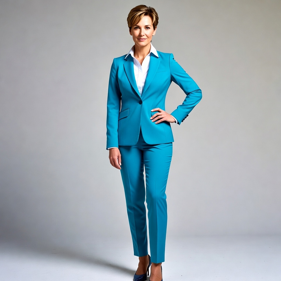 A woman with short brown hair stands confidently with one hand on her hip against a gray background. She wears a tailored turquoise suit jacket and matching pants with a white collared shirt underneath. She completes the look with black high-heeled shoes.
