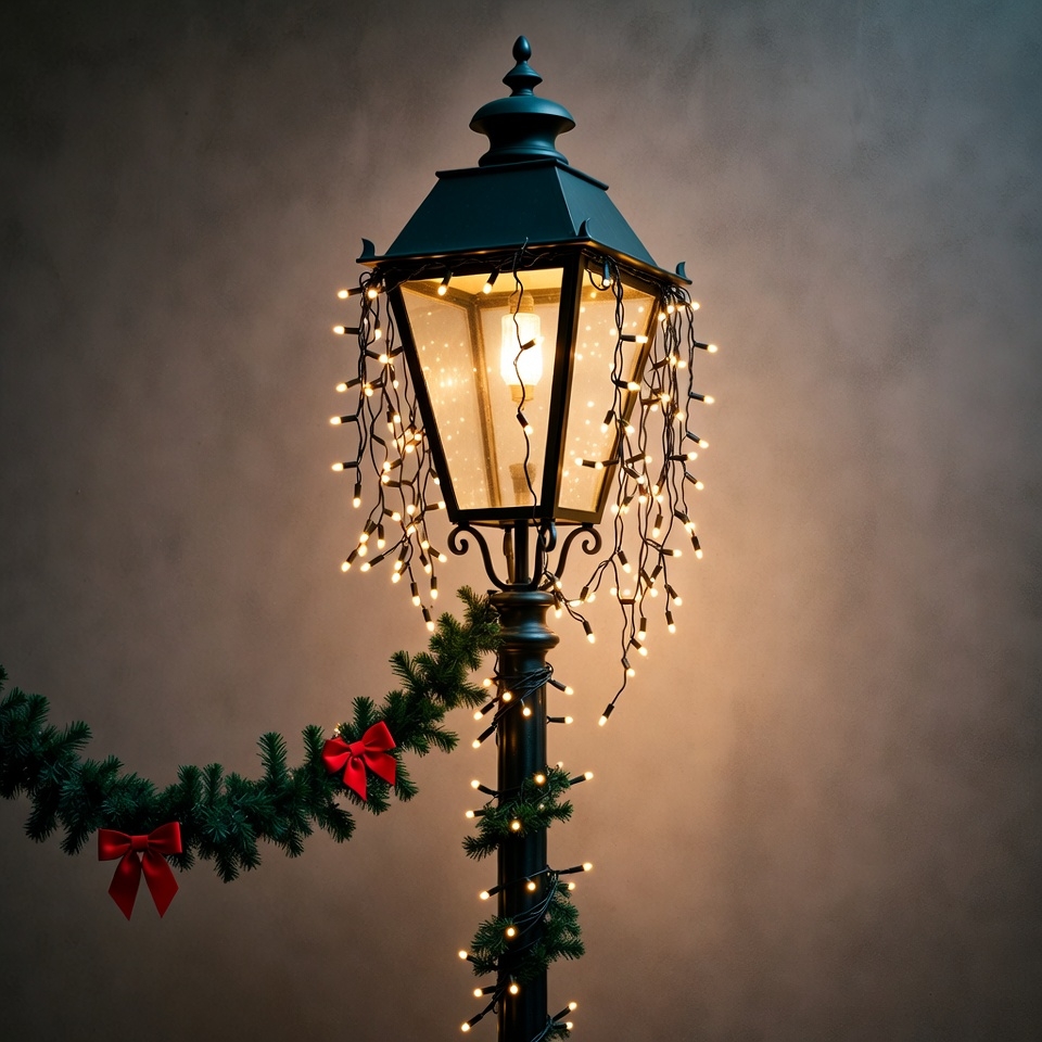 A vintage black metal street lamp glows with warm light from its glass enclosure. Fairy lights drape around the lamp post, and green garland with red bows wraps around the base. The scene is set against a dark gradient background.