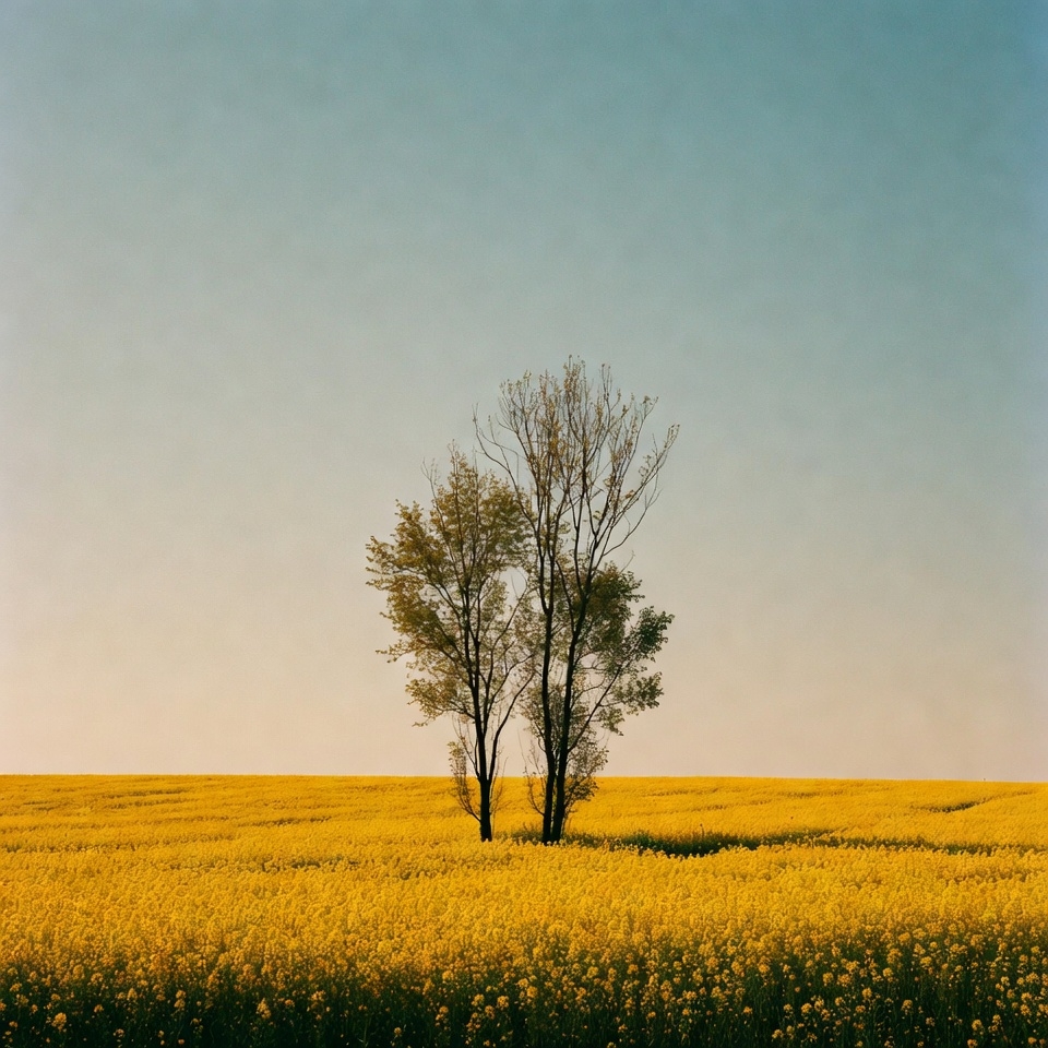 Two tall trees with sparse autumn foliage stand side by side in a vast field of blooming yellow rapeseed flowers. The sky above is clear and pale blue, creating a striking contrast with the golden field. The scene captures a serene rural landscape under natural daylight.