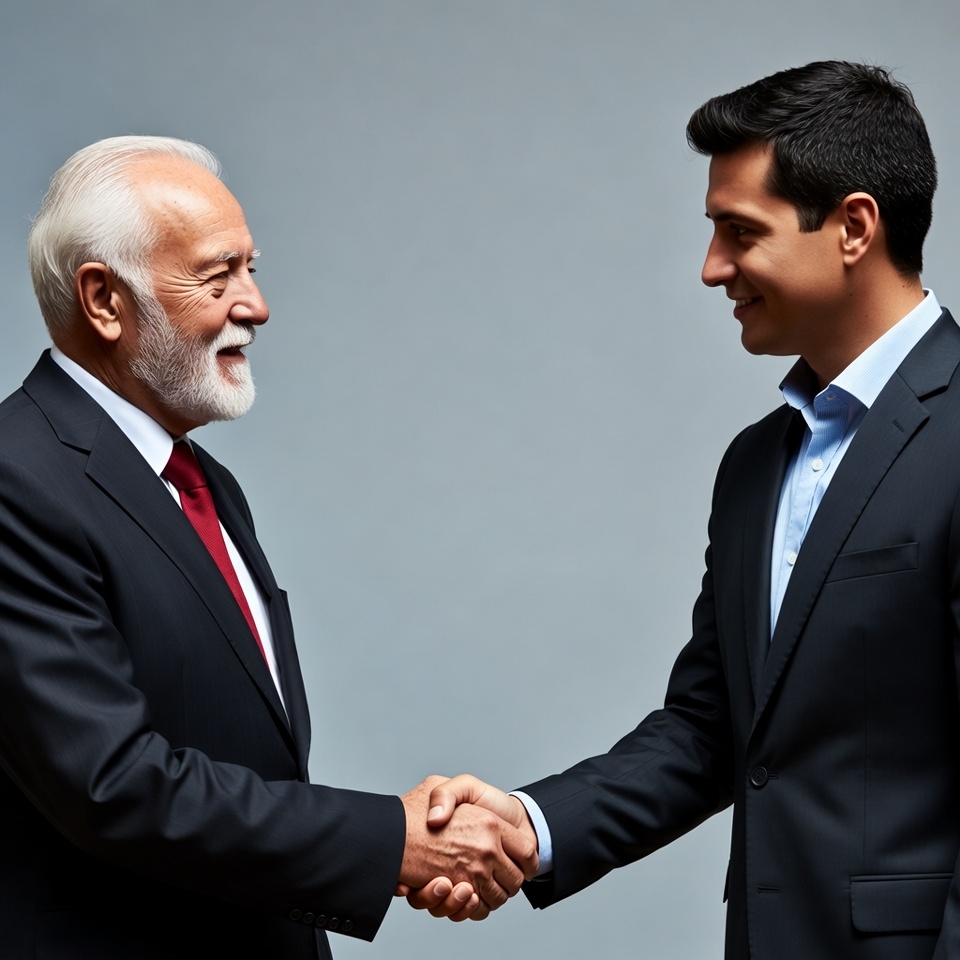 An elderly man with white hair and beard, dressed in a dark suit and red tie, shakes hands with a young man in a dark suit and light blue shirt. Both men smile warmly during the handshake. They stand against a plain gray background.