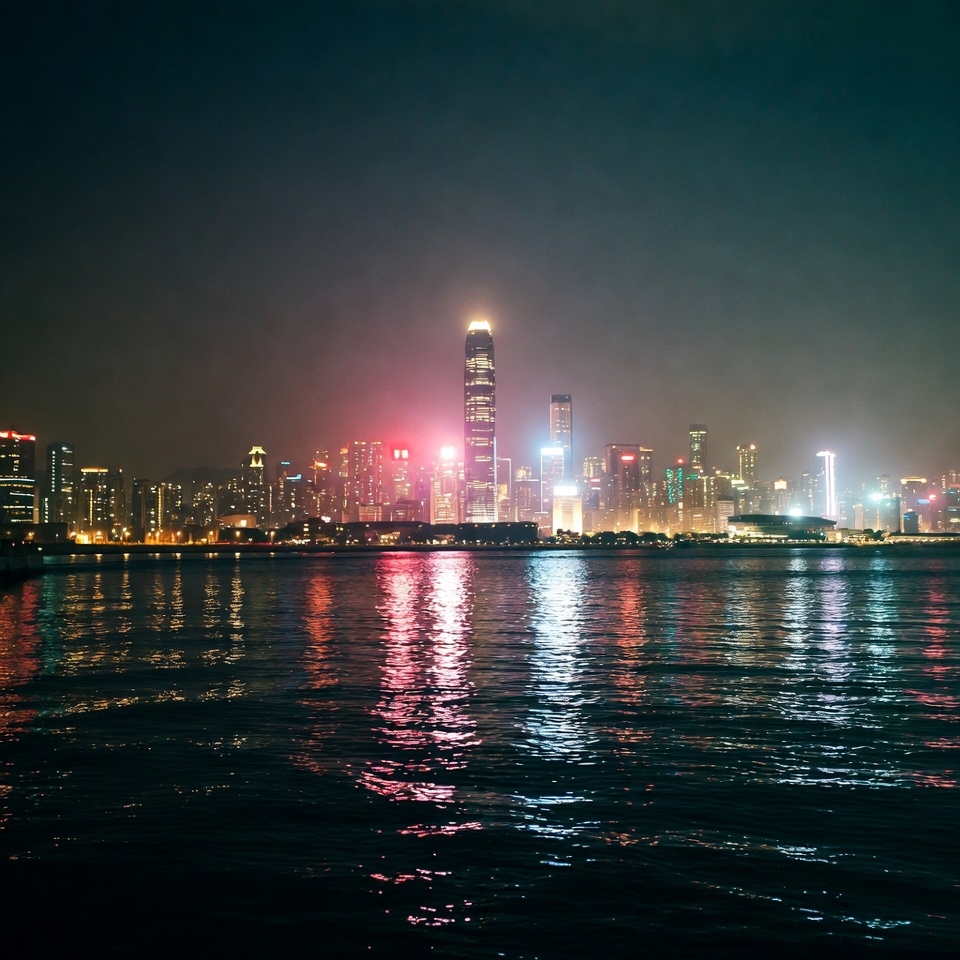 A vibrant city skyline of Hong Kong glows with colorful lights at night, reflecting on the calm waters of Victoria Harbour. Tall skyscrapers, including the distinctive International Commerce Centre, dominate the scene. The dark sky contrasts with the neon reds, blues, and whites illuminating the buildings.