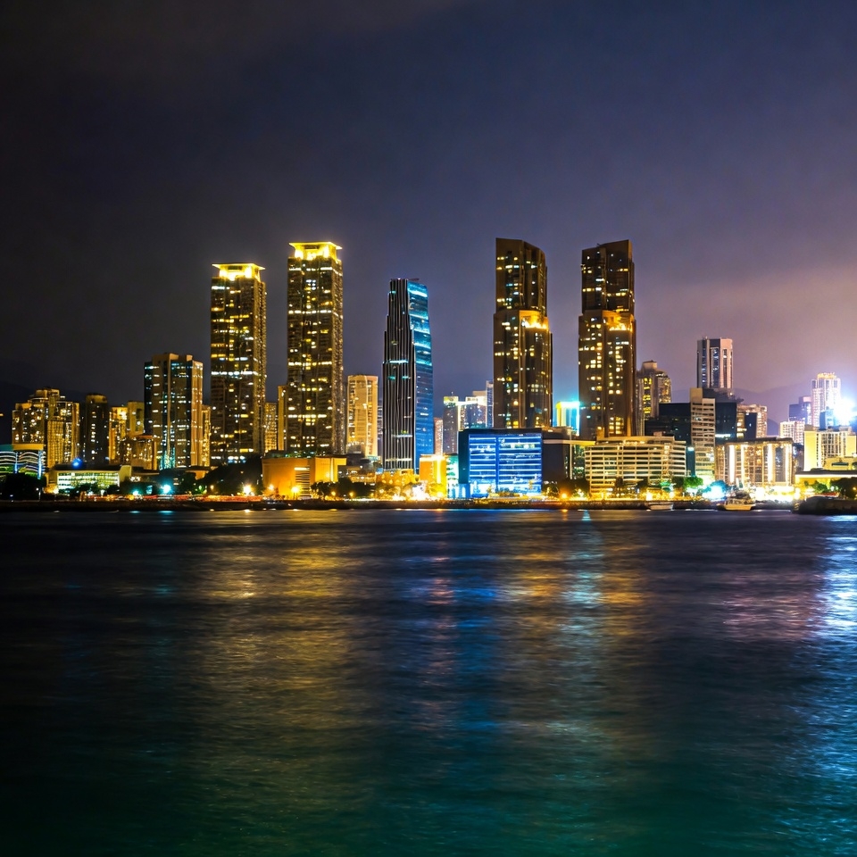 architecture, blue lights, building lights, city lights, cityscape, dark sky, evening skyline, glowing lights, harbor view, high-rises, illuminated towers, metropolis, modern buildings, night, night city, reflection, skyline view, skyscrapers, tall buildings, urban landscape, urban night, water reflection, water surface, waterfront, yellow lights, city skyline