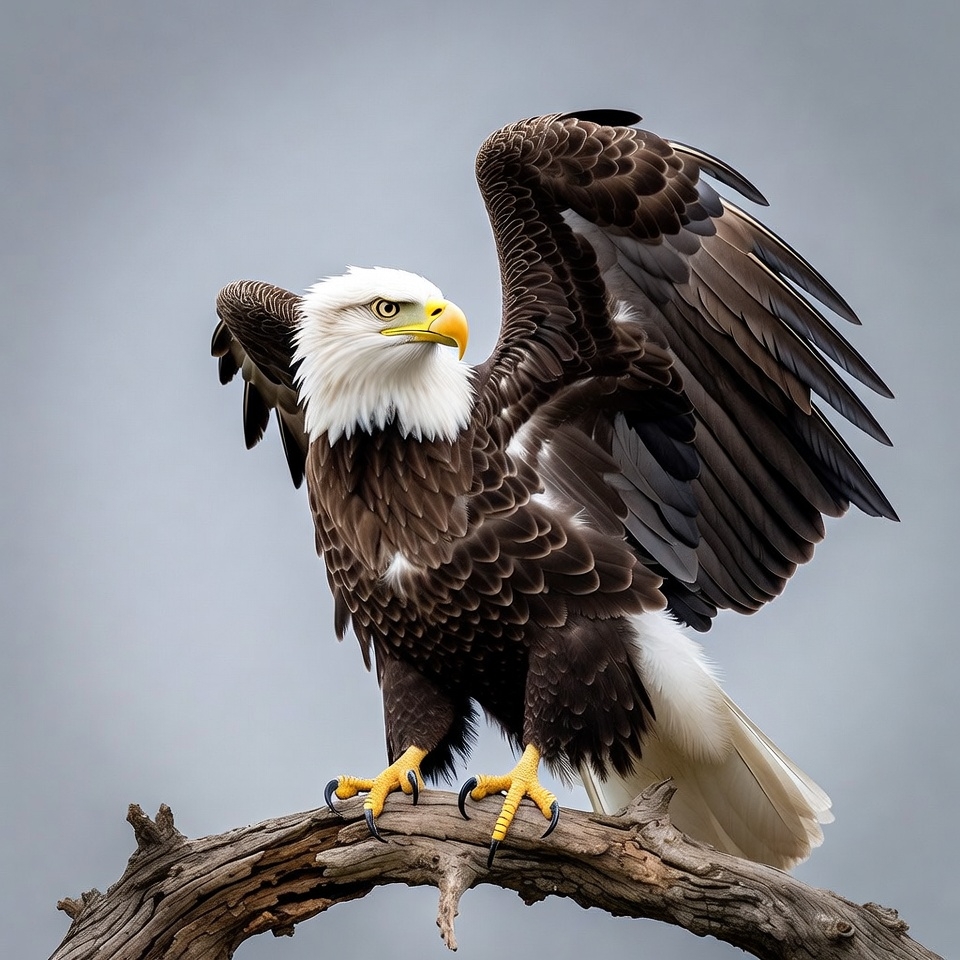 A majestic bald eagle stands on a gnarled wooden branch with wings spread wide. Its white head contrasts sharply with dark brown feathers and yellow beak. The background is a soft gray, highlighting the bird's detailed plumage.