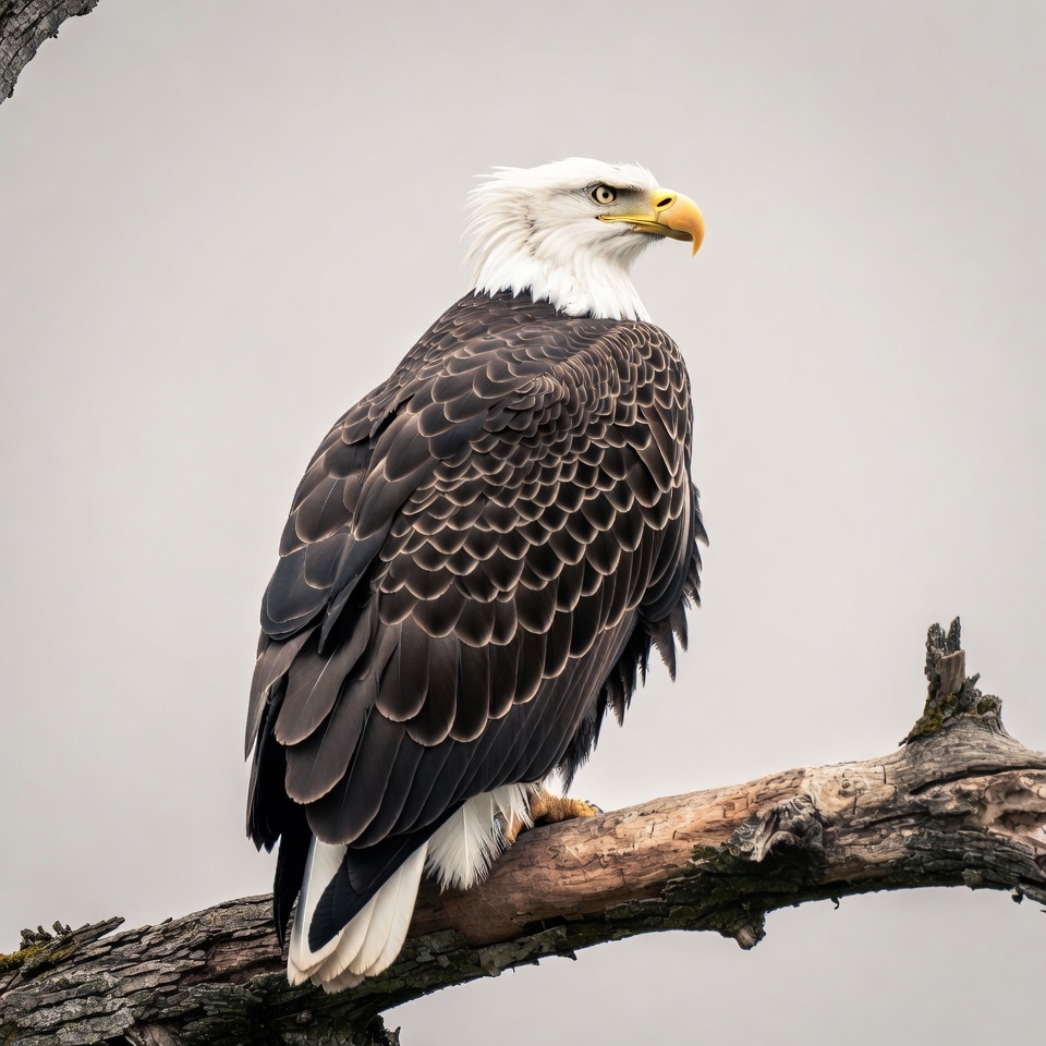 A majestic bald eagle with white head, yellow beak, and dark brown body stands on a gnarled tree branch. Its wings are slightly folded, and tail feathers fan out behind. The background is a soft gray sky.