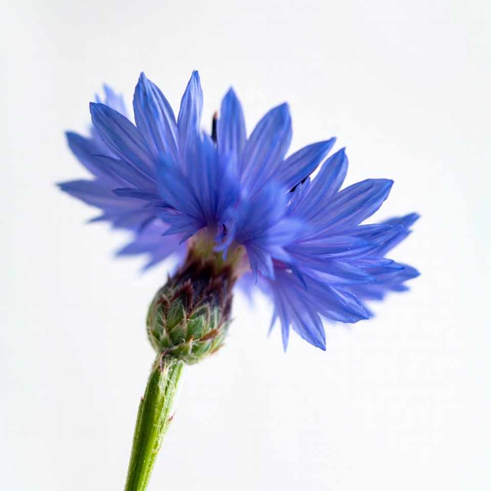 A vibrant blue cornflower blooms with layered petals on a slender green stem. The flower features a textured green center bud and fine details on its ray florets. It is isolated against a plain white background.