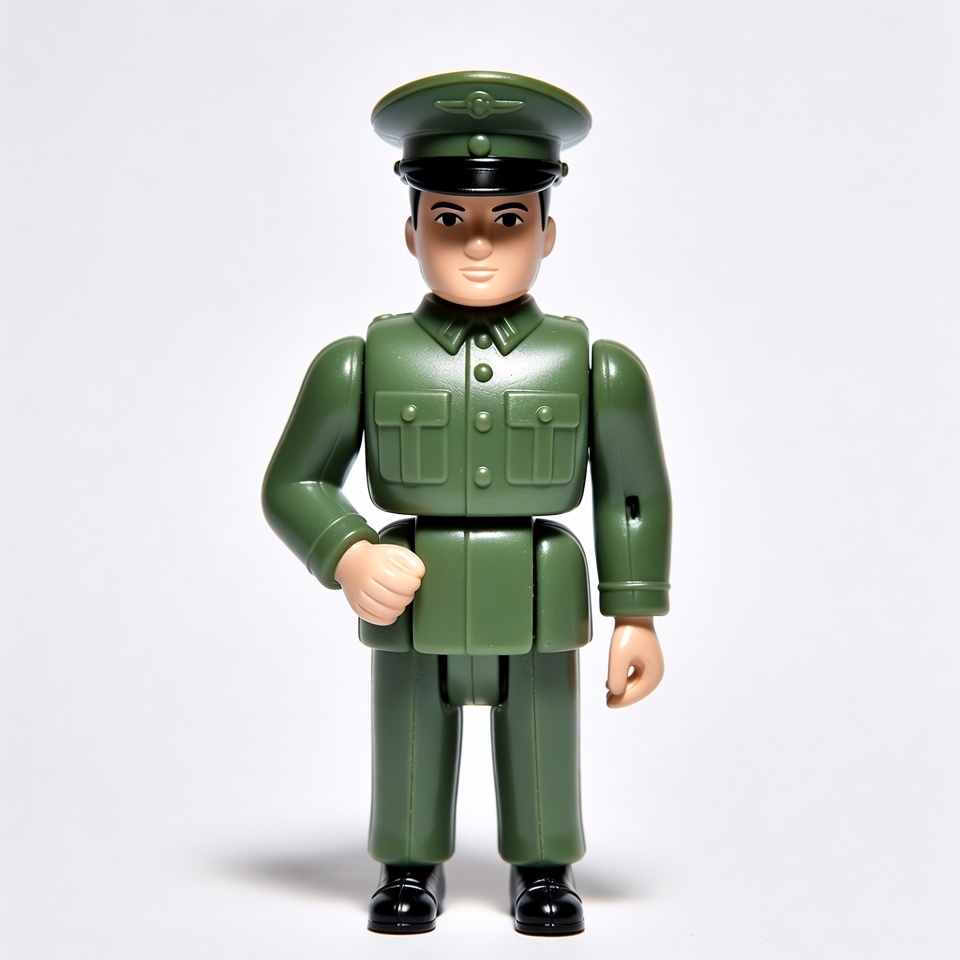 Asian, action figure, army, army man, boots, figurine, green uniform, illustration, male, military uniform, peaked cap, plastic toy, standing pose, toy soldier, uniform, white background, soldier