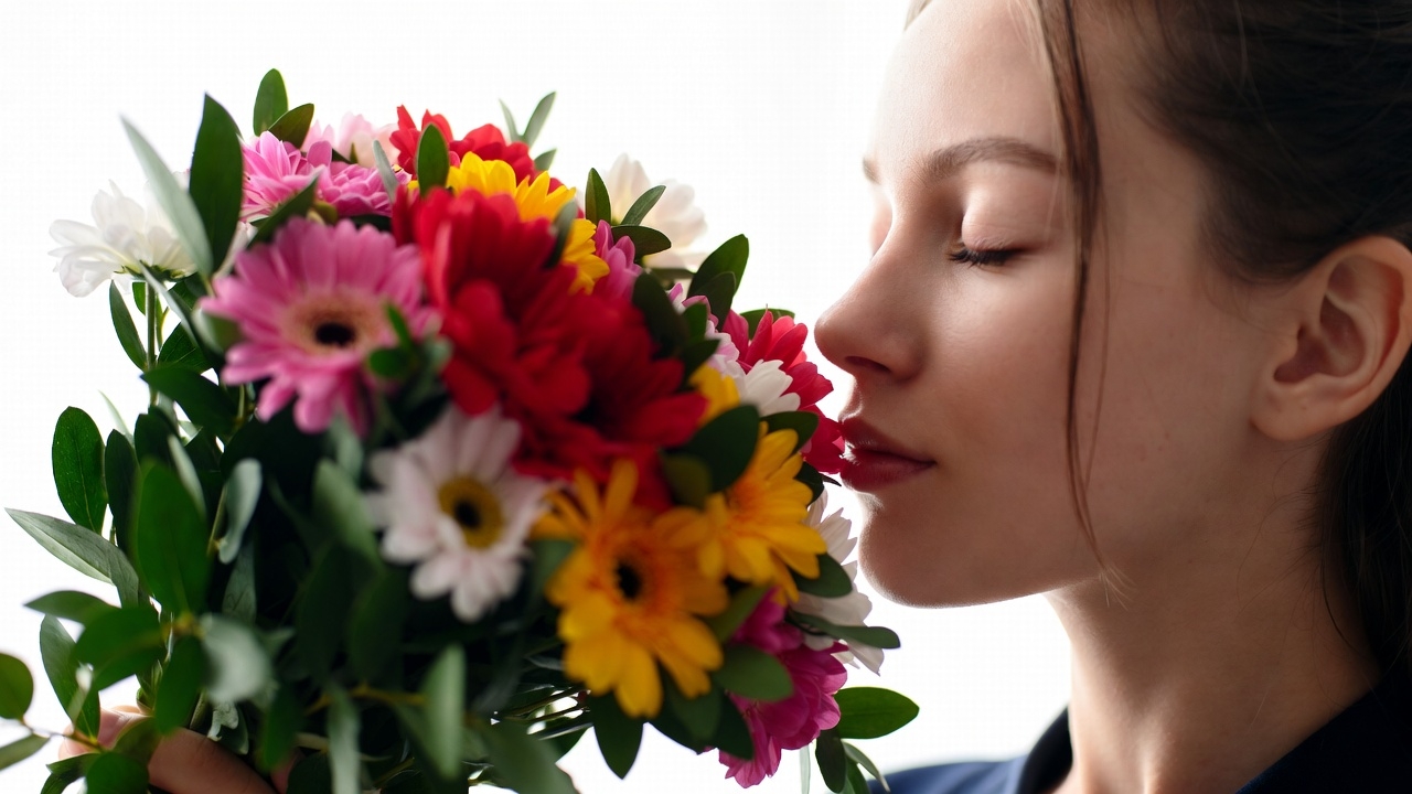White, bouquet, chrysanthemums, close-up, colorful flowers, female, floral arrangement, fresh flowers, gerbera daisies, green leaves, isolated background, pink flowers, portrait, red flowers, smelling flowers, sniffing bouquet, white flowers, yellow flowers, young woman, woman