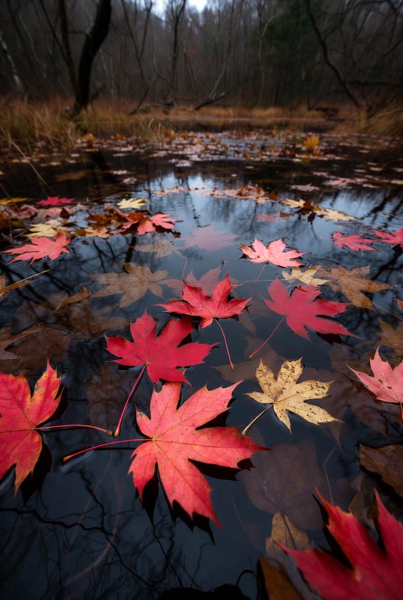 Vibrant red and yellow maple leaves float on the dark surface of a shallow pond surrounded by bare autumn trees. The water reflects the colorful foliage and surrounding reeds. A forested backdrop with twisted branches frames the serene scene.