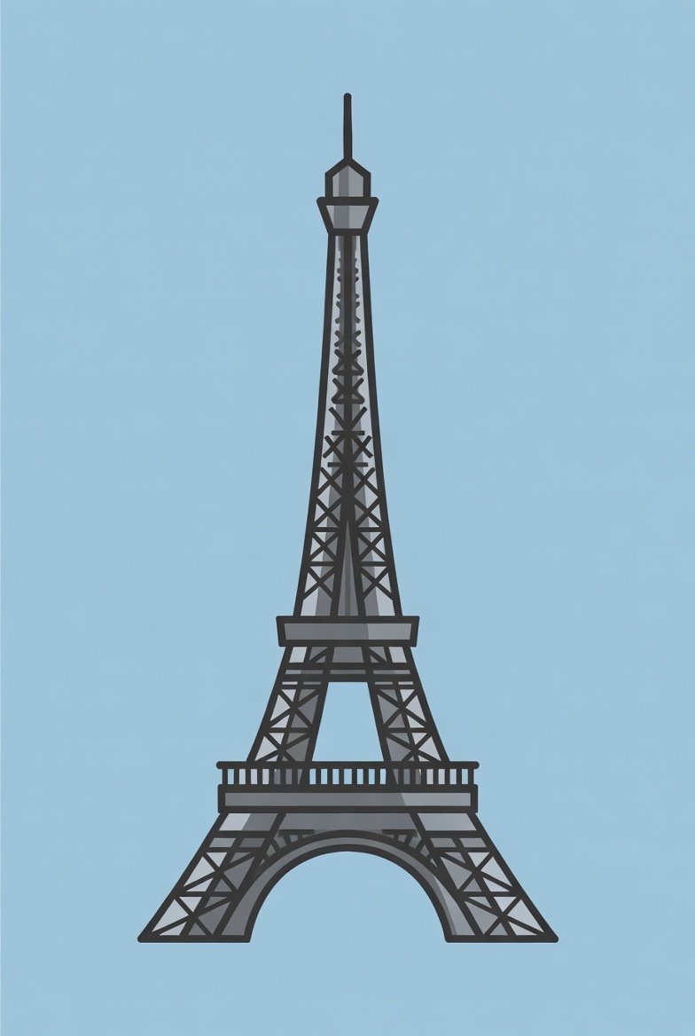 A simple line art illustration of the Eiffel Tower stands centered on a light blue background. The tower is depicted in gray outlines with detailed lattice structure and arched base. It features a flagpole at the top.