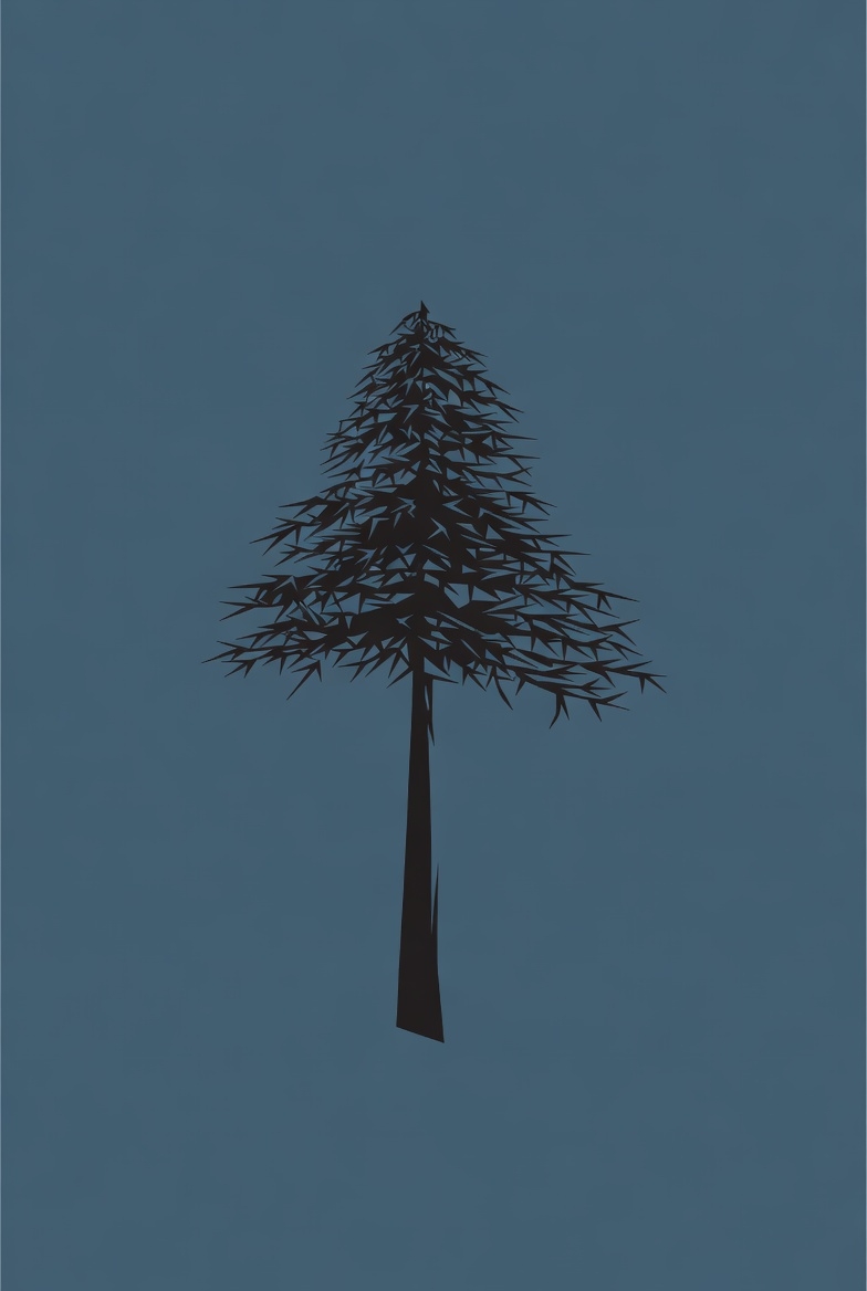 A tall pine tree rendered in a detailed black silhouette stands centered against a solid navy blue background. The tree features dense branching needles and a straight trunk. The isolated illustration emphasizes sharp outlines and minimalistic design.