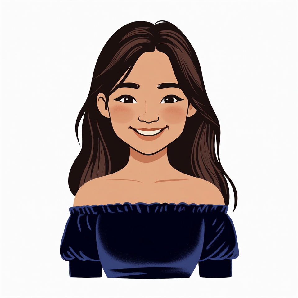Asian, avatar, brown hair, cartoon, clipart, cute, dark hair, female, flushed cheeks, headshot, isolated background, long hair, navy blue top, off-shoulder top, portrait, smiling, woman, young woman, illustration
