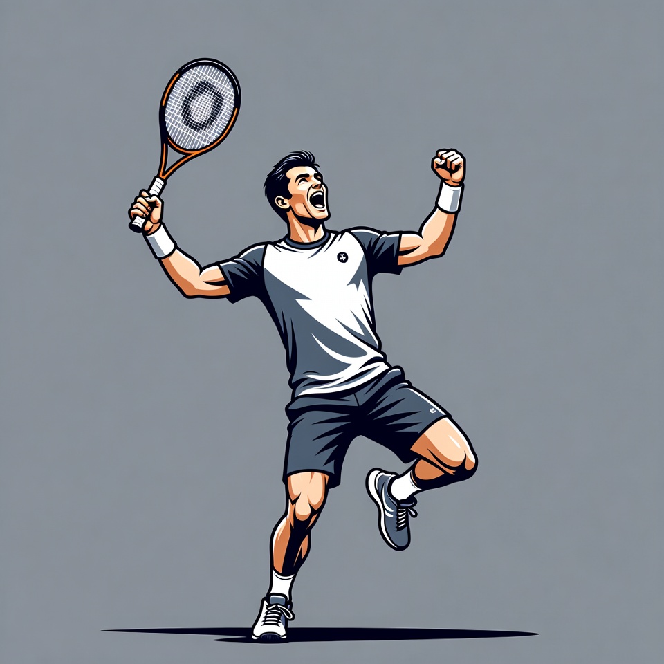An illustration of a muscular man triumphantly celebrating with a tennis racket raised high. He wears a white and gray short-sleeved shirt, dark shorts, and white sneakers, standing dynamically on one leg against a gray background. His mouth is open in a shout of victory, with clenched fists.