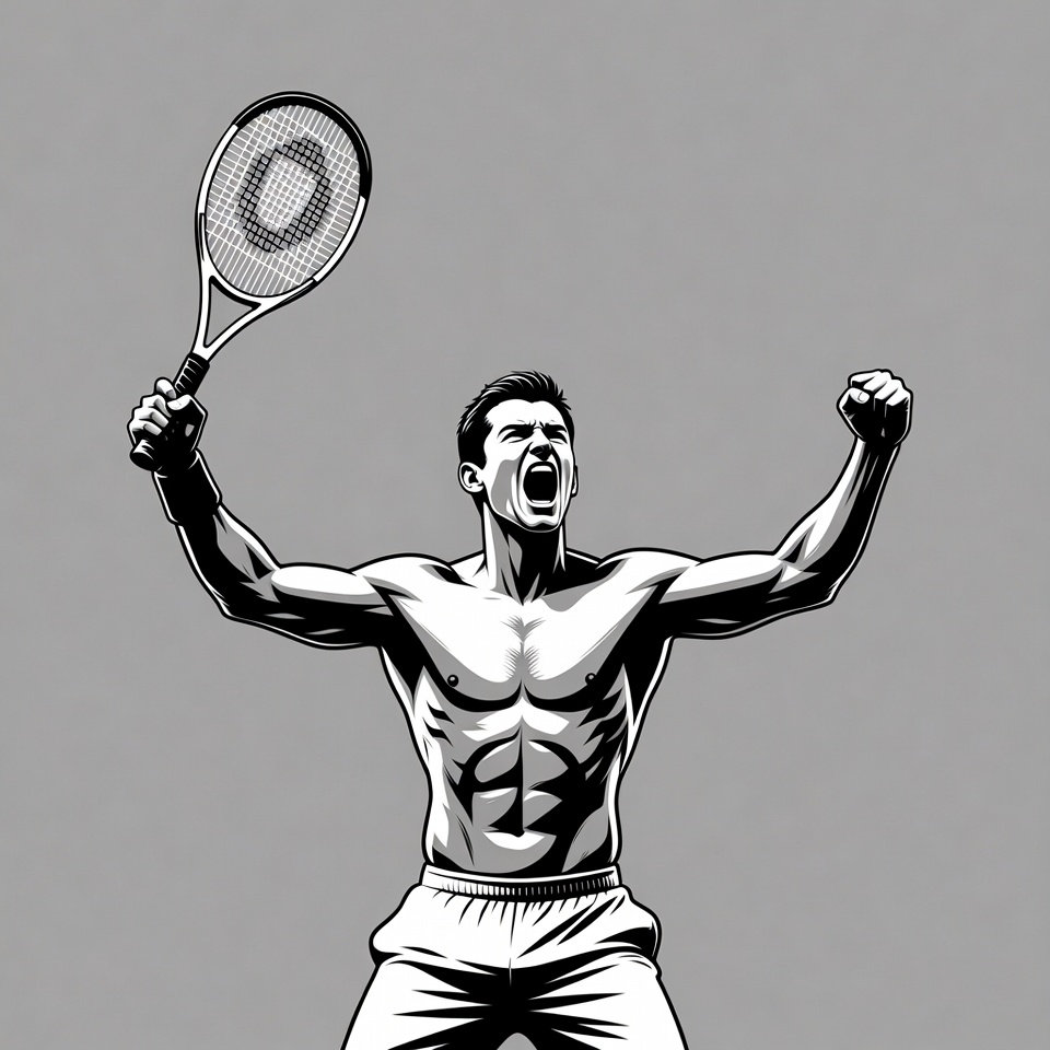 A muscular man with short dark hair stands triumphantly holding a tennis racket overhead with both hands raised in victory. He is shirtless, wearing white shorts, and shouting with an open mouth. The image is a black and white illustration on a gray background.
