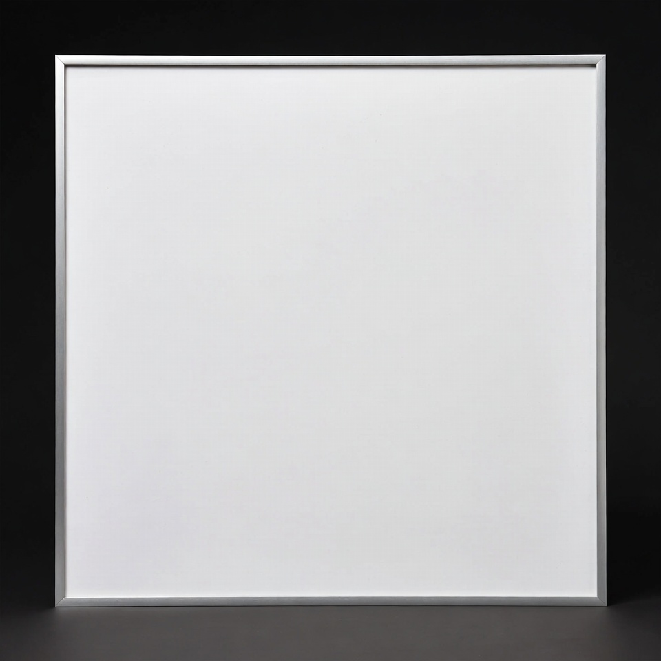 A square white picture frame with a thin silver border stands against a black background. The frame encloses a completely blank white surface. It is centered and isolated for clear visibility.