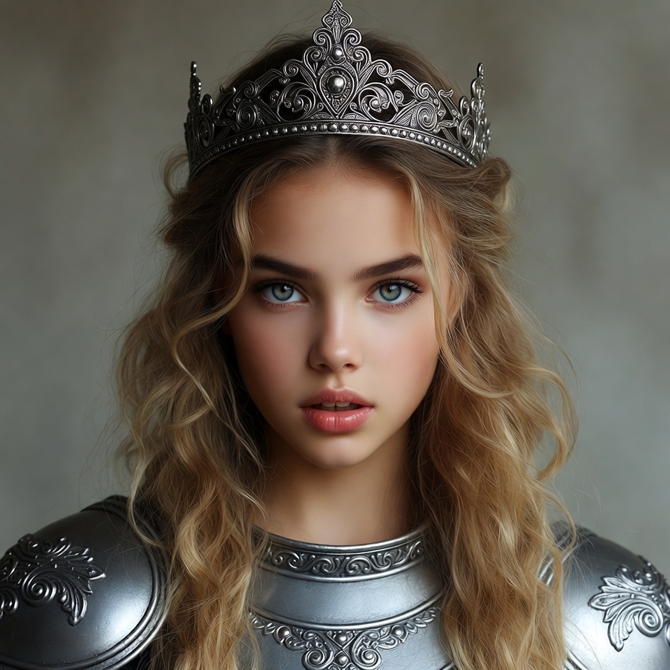 White, armor chestplate, beautiful woman, blonde hair, blue eyes, closeup portrait, crown, detailed crown, elegant, fantasy, female, historical costume, jewelry, long hair, medieval armor, ornate crown, portrait, queen, regal, silver armor, silver jewelry, warrior woman, wavy hair, young woman, woman