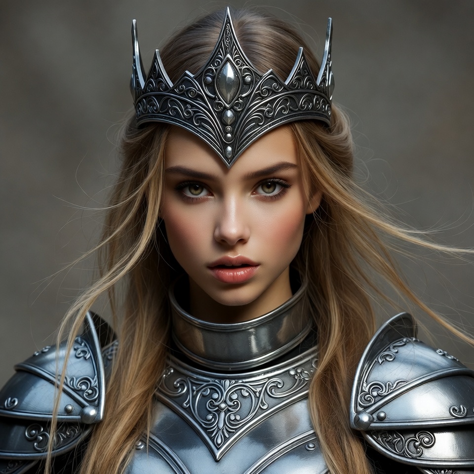 A young woman with long blonde hair wears an ornate silver crown with pointed spikes and gem details. She has piercing green eyes and subtle makeup, gazing directly at the viewer. She is dressed in intricate metallic armor with engraved patterns over a high collar, set against a dark gradient background.