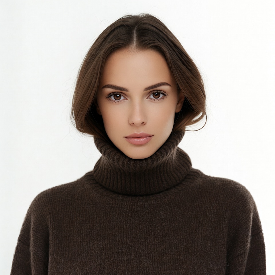 A young woman with long brown hair gazes directly at the camera against a white background. She wears a cozy brown turtleneck sweater that covers her neck. Her makeup is natural with subtle pink lips and defined eyes.