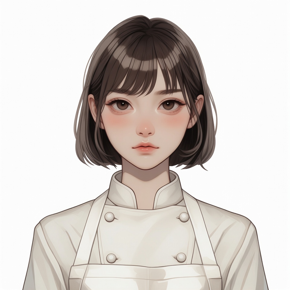 A young Asian woman with straight black bob haircut and bangs stares forward with a subtle expression. She wears a white chef's jacket with a high collar and double-breasted buttons. The digital illustration features her on a plain background.