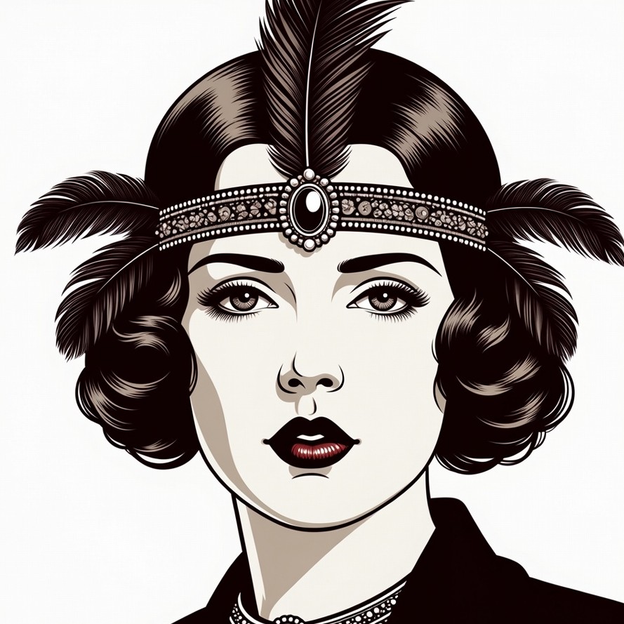 An illustration of a woman in 1920s flapper style features a detailed black and white portrait with vibrant accents. She wears an ornate headband adorned with large feathers and a central gemstone, framing her bobbed curly hair. Her face shows bold red lips, dark expressive eyes, and elegant jewelry around her neck.
