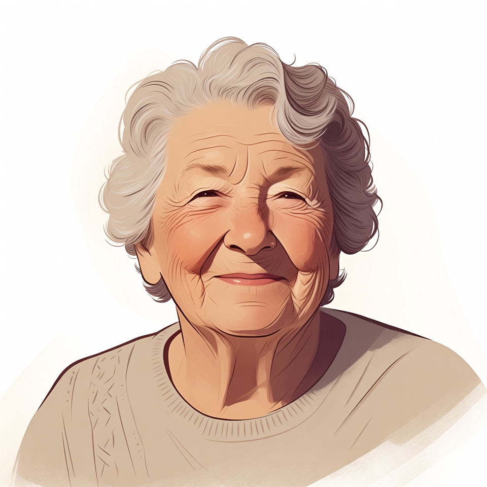 A digital illustration of an elderly White woman with curly gray hair smiles warmly at the viewer. She has wrinkled skin, rosy cheeks, and bright eyes, wearing a light-colored knit sweater. The portrait is set against a plain white background.