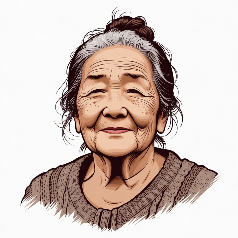 A digital illustration of an elderly Asian woman with gray hair in a loose bun. She has wrinkled skin, smiling eyes, and wears a brown knitted sweater. The portrait is on a white isolated background.
