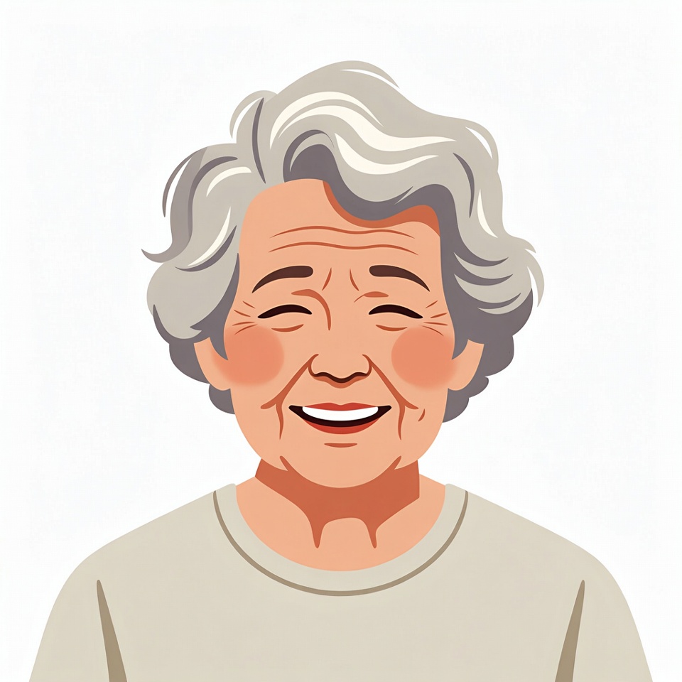 A cartoon illustration of an elderly Asian woman with silver wavy hair smiles happily with eyes squinted and rosy cheeks. She wears a light beige crewneck shirt. The image is isolated on a white background.