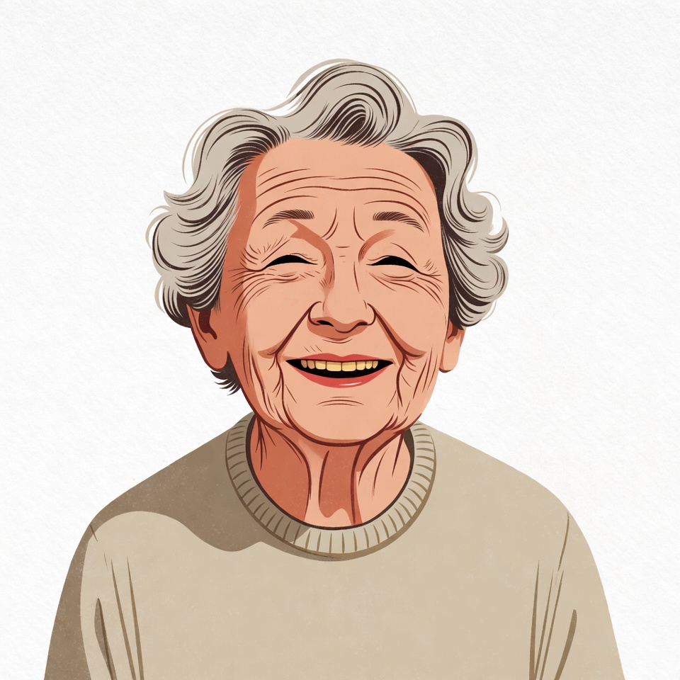 A cartoon illustration of an elderly Asian woman with wavy gray hair smiles warmly at the viewer. She has squinted eyes and a wide grin revealing her teeth. She wears a light beige sweater collar on a white isolated background.