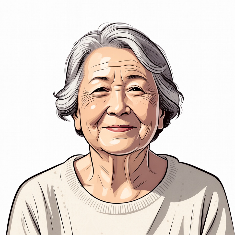 A detailed illustration of an elderly Asian woman with short gray hair smiles warmly at the viewer. She has fine wrinkles around her eyes and mouth, and wears a light-colored sweater with a rounded neckline. The portrait is set against a plain white background.