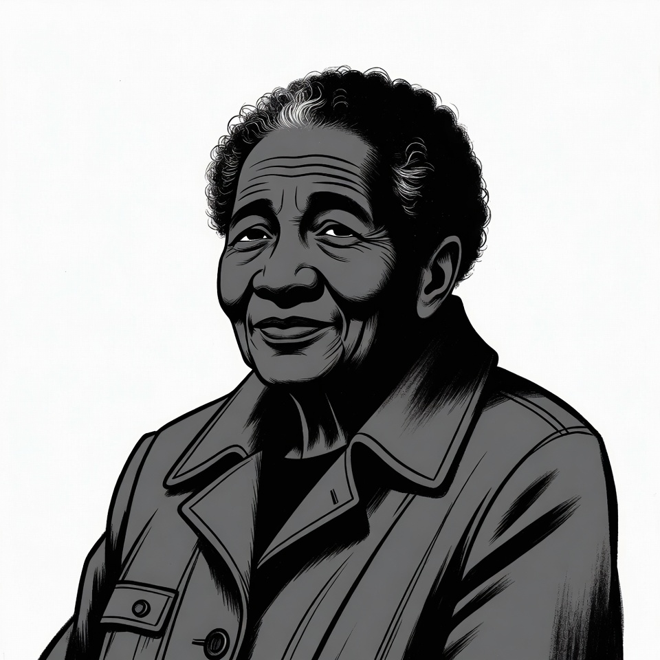A black and white illustration of an elderly African-American woman with curly gray hair smiles warmly at the viewer. She wears a collared shirt under an open coat with lapels and stands against a plain white background. Her expression is gentle with fine lines around her eyes and mouth.