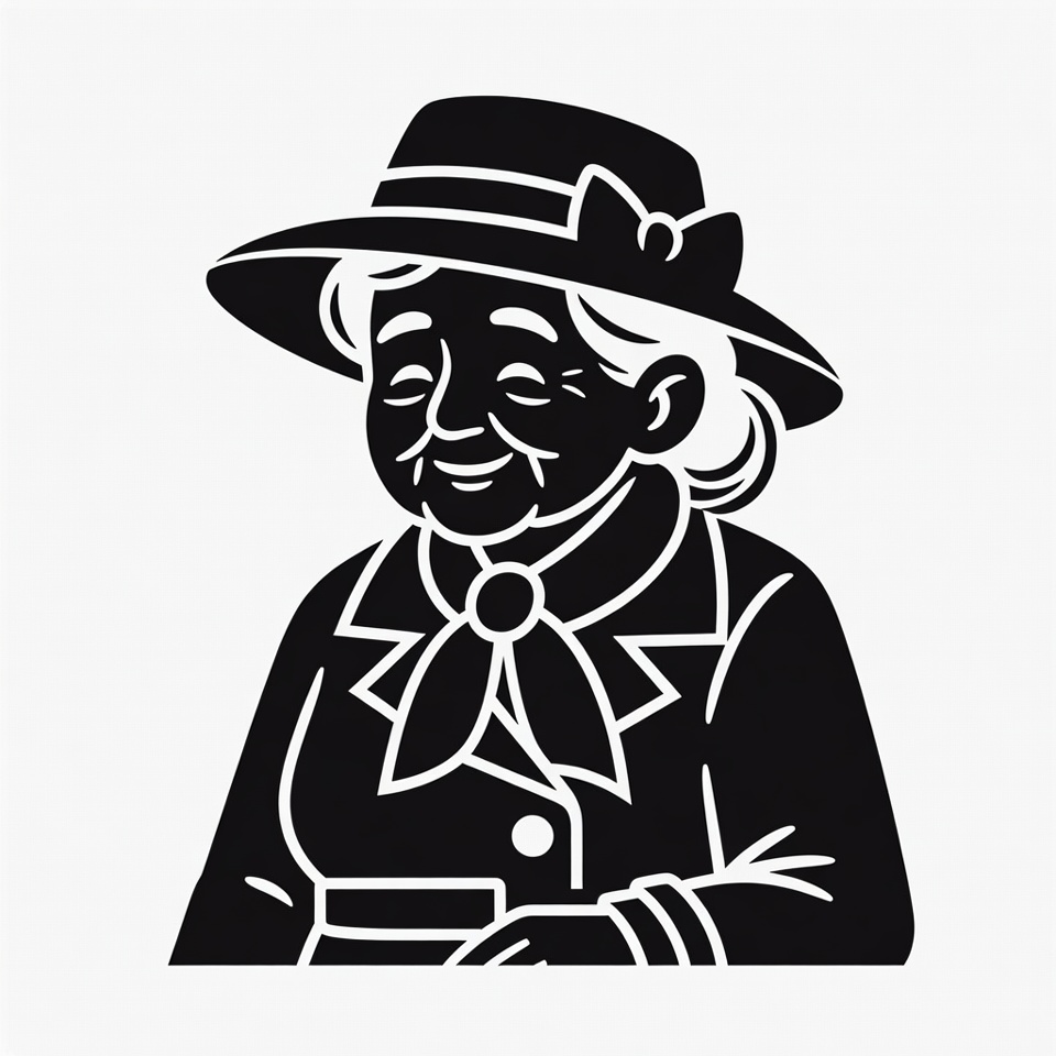 White, black outline, clipart, closed eyes, collared coat, female, hat with bow, illustration, isolated background, neck scarf, old woman, senior lady, silhouette, smiling, vector art, vintage style, wide hat, woman, elderly woman