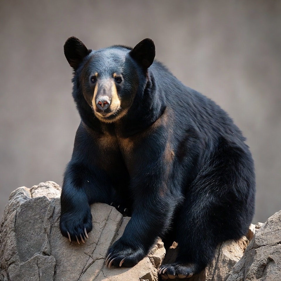 A black bear with shiny fur sits on a large rock against a blurred natural background. Its paws rest on the rock surface, and it gazes forward with expressive eyes. The bear's thick fur and muscular build are prominently visible.