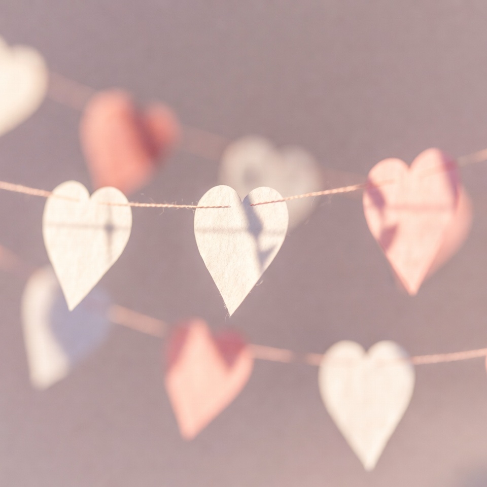 blurred background, bokeh, craft hearts, garland, hanging hearts, heart decoration, heart garland, love symbols, paper craft, paper hearts, pink hearts, romantic decor, soft focus, string garland, suspended hearts, twine string, valentine hearts, valentines day, white hearts, hearts