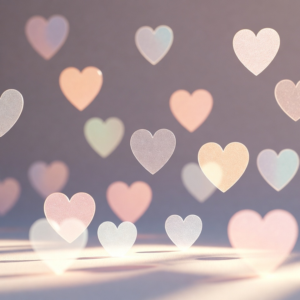 Numerous translucent hearts in pastel shades of pink, purple, and yellow float against a soft gray background. The hearts exhibit a bokeh effect with glowing edges and subtle light flares. They vary in size and are scattered in a dreamy, overlapping arrangement.