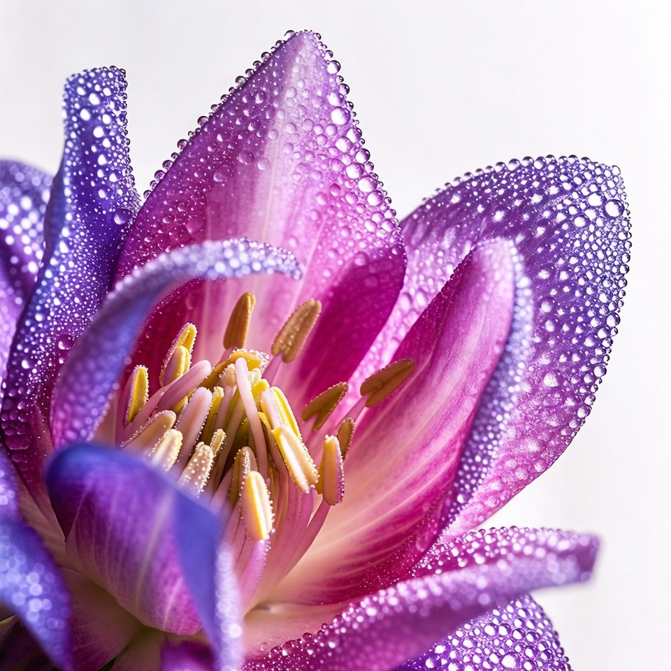 blooming lily, dew drops, droplet covered, floral macro, flower closeup, fresh flower, glistening petals, isolated flower, lily flower, macro photography, magenta hues, nature flower, pink center, purple petals, vibrant purple, water beads, water droplets, white background, yellow stamens, purple lily