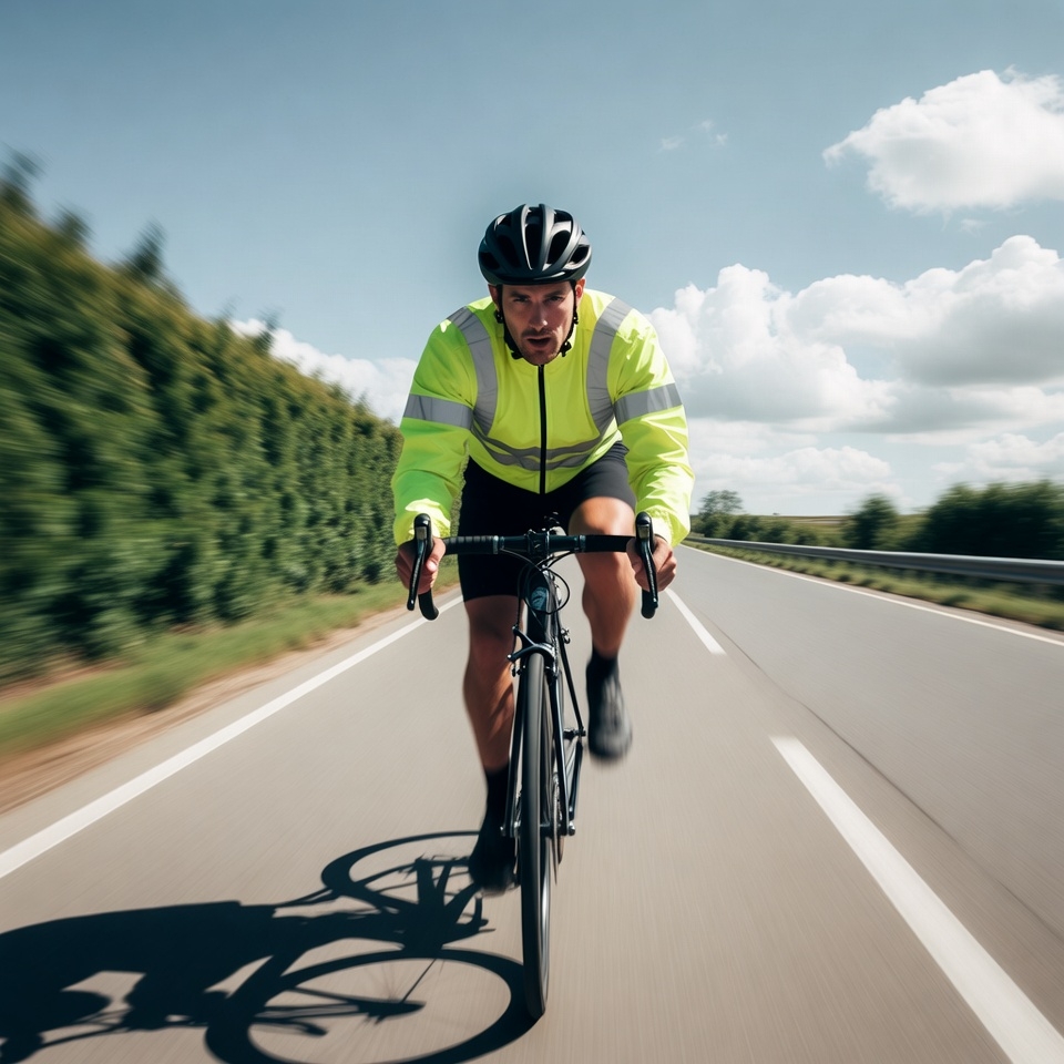 White, bicycle, biking, black helmet, blue sky, clouds, cycling, cycling shorts, cyclist, cyclist man, hedges, hi-vis jacket, highway, male, motion blur, outdoor cycling, pedals, road, road bike, road cycling, safety vest, wheels, yellow jacket, man